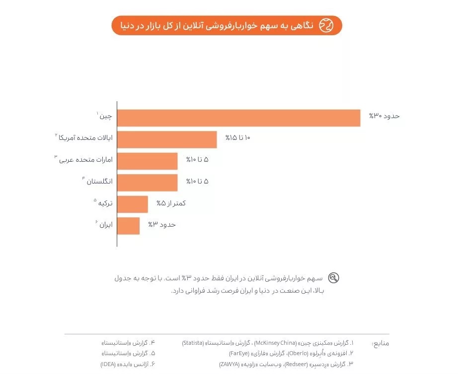 در بخش دیگری از این گزارش که به سرویس «اسنپمارکت» اختصاص یافته، با نگاهی به سهم خواروبارفروشی آنلاین از کل بازار در دنیا، آمده است: «سهم خواروبارفروشی آنلاین در ایران فقط حدود ۳ درصد است و این صنعت در دنیا و ایران فرصت رشد فراوانی دارد.»