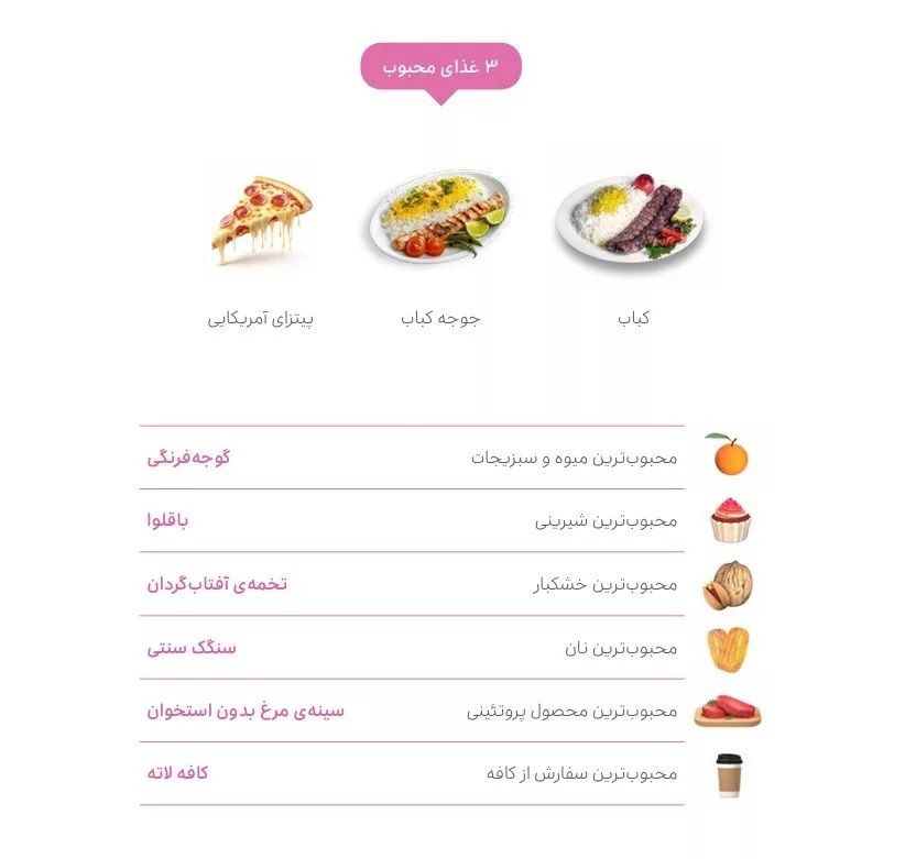 طبق گزارش اسنپ، «کباب»، «جوجهکباب» و «پیتزای آمریکایی» سه غذای محبوب کاربران اسنپفود بودهاند.