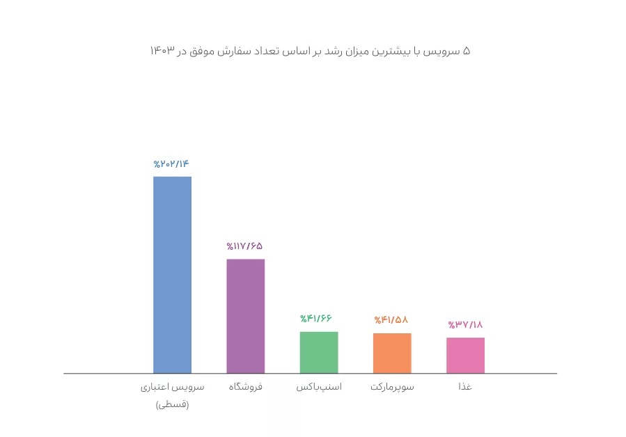 سرویس «اسنپپی» نیز که از سال ۱۴۰۱ شکل گرفته بود و در سال ۱۴۰۲ شاهد یک هزار و ۱۷۵ درصد رشد بود، در سال ۱۴۰۳ با آهنگی آرامتر رشد ۲۹۵ درصدی مبلغ سفارشها را تجربه کرده است. مجموع سفارشهای سرویس اعتبار اقساطی نیز ۲۰۲ درصد افزایش یافته است.